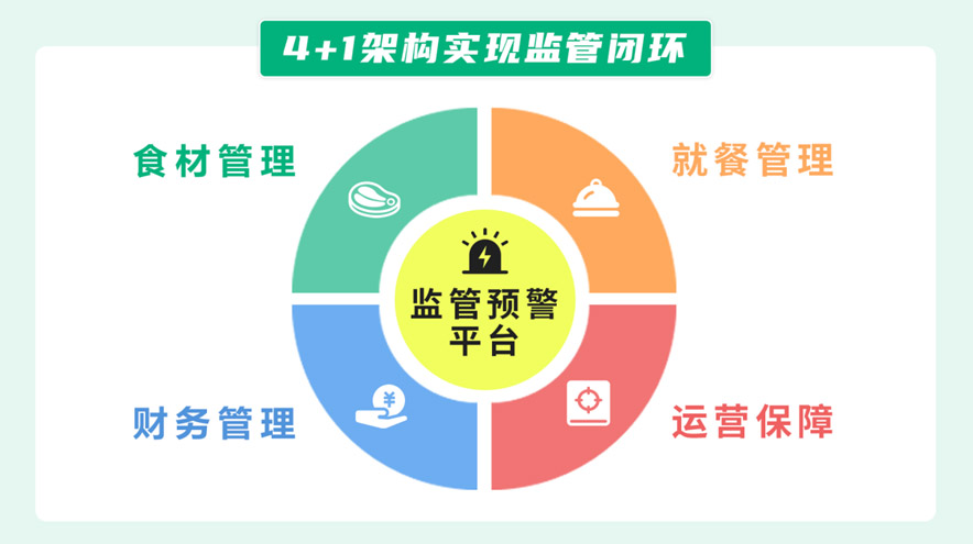 而落地这一格局的关键,在于织就“一张网”——威尔数据中小学校食堂智慧管理系统正是针对这些痛点而设计,其"4+1"系统架构为破解这些难题提供了技术支撑。该系统的食材管理、就餐管理、财务管理和运营保障四个子系统,与监管预警平台共同构成了完整的监管闭环。食材管理系统确保采购流程规范透明,就餐管理系统实现消费数据实时可溯,财务管理系统保障资金流转清晰可查,运营保障系统则将日常作业数字化。这些系统数据的互联互通,为跨部门协同提供了基础。