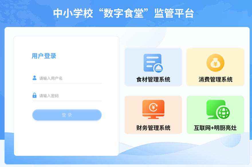 山东威尔数据推出的校园餐监管平台,采用了1+4架构,所谓“1”,就是一个监管平台;“4”则是指四大功能模块:消费管理、财务管理、食材管理、互联网+明厨亮灶。