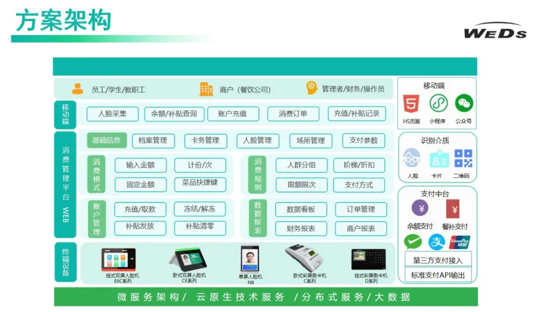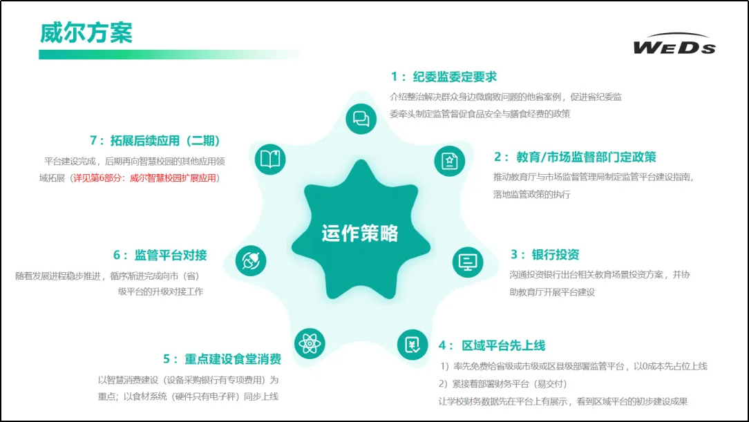 威尔方案整合了不同使用角色、不同使用终端,无论师生家长还是供餐商户,都能在这个架构下完美兼容,与此同时,监管单位、维护人员也能便捷查阅各类信息,实现监管全覆盖,细致到每一张餐盘。